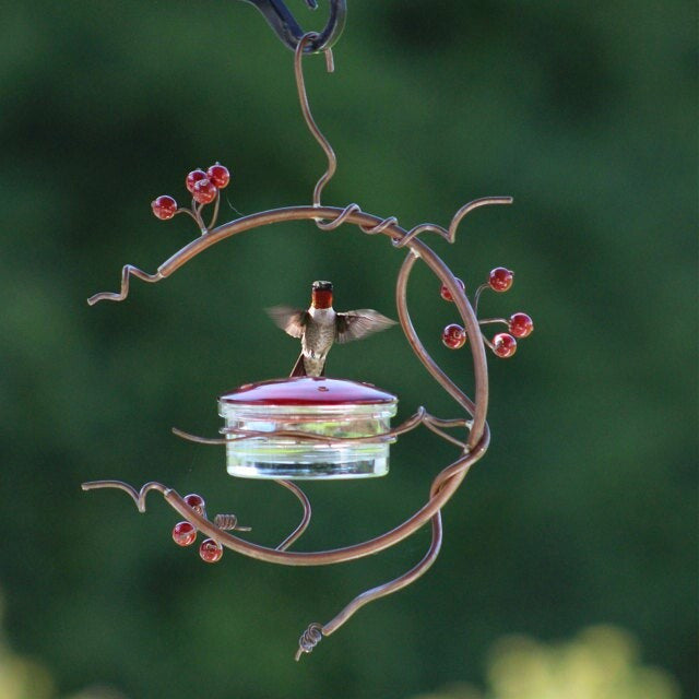 The bowl fits tightly in the copper coil. Pushing up on the bowl from the bottom helps to remove it. PLEASE BE CAREFUL WHEN OPENING THE SMALL BOX CONTAINER THE JAR AND LID. This feeder is 9 inches long(top of hanger to bottom of vines) and 6.3 inches wide at its largest points. These feeders will be made as they are ordered and each may vary slightly as they are handcrafted. Please allow slight deviation for the color and measurement! please understanding, thanks Package Content: